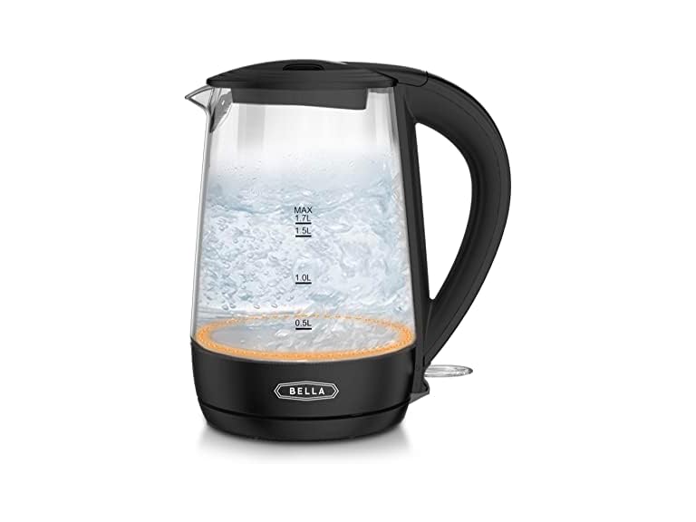 - (1) BELLA 1.7 Liter Glass Electric Kettle, Quickly Boil 7 Cups of Water in 6-7 Minutes, Soft Red LED Lights Illuminate While Boiling, Cordless Portable Water Heater, Carefree Auto Shut-Off - Choose Color