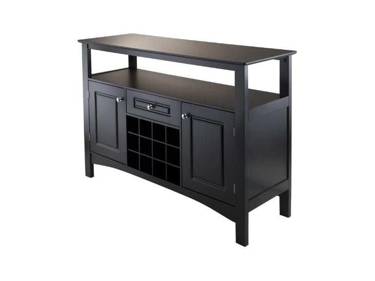 Versatility is the hallmark of the Winsome Wood Jasper Buffet Display Cabinet. This modern piece can be the highlight of your living room to store your wine, stemware and display collectibles. Or let it stand out in the dining room as a sideboard to showcase your best serve ware, while keeping a few favorite bottles of wine on hand. Store up to 12 bottles in the wine grid or use this space as storage as you have the option to remove the grid for an additional open shelf. A unit-wide open shelf is ideal for setting out glasses and plates, or for display purposes. Just below is a center drawer that provides ample space for silverware, wine opener and other accessories. Plenty storage inside the two doors, on each end, just over 16in. allowing storage height for bottles or decanters. Constructed of sturdy, durable composite wood in a solid, sleek black with nickel finished knobs. Conveniently packed and shipped in 1 box, that includes the hardware necessary for assembling. Replacement part request can be submitted directly to the manufacturer within 60 days from date of purchase Unit dims: 45.75"W x 15.75"D x 32.1"H Open shelf surface: 49.3"W x 14.3"D, 6.8" clearance Wine slots: 3.5"W x 13.75"D x 3.5"H Drawer (interior) dims: 13.9"W x 11"D x 3.5"H Two side cabinet (interior) dims: 12.25"W x 13.3"D x 16.6"H ea. Ships in 1 box Assembly is required