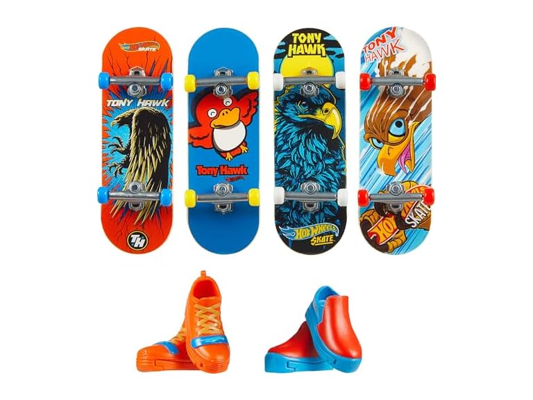- (1) Hot Wheels Skate Tony Hawk Fingerboard & Removable Skate Shoes Multipack, 4 Fully Assembled Boards, 2 Pairs of Skate Shoes, 1 Exclusive Set (Styles May Vary)