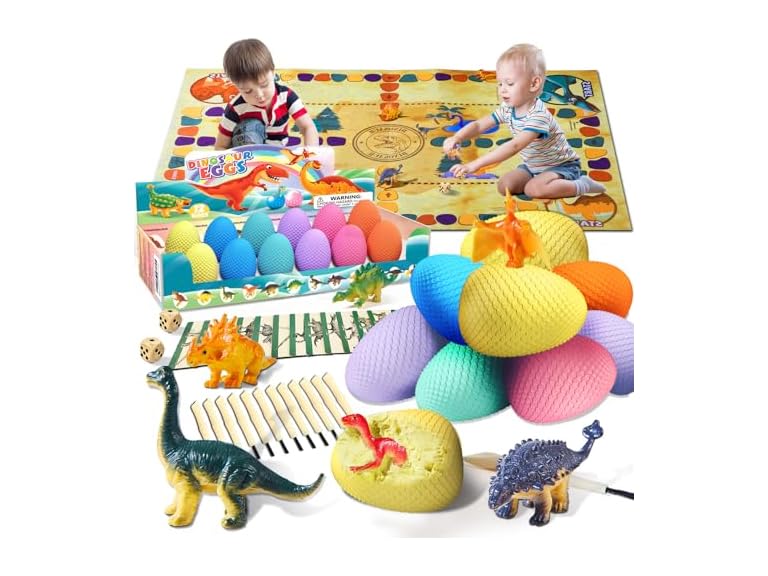 - 【 What You Get 】 The dinosaur dig kit includes 12 dinosaur fossil eggs, 12 chisel/brushes, 12 dinosaur knowledge cards, 2 dices and 1 XL dinosaur chess play mat.