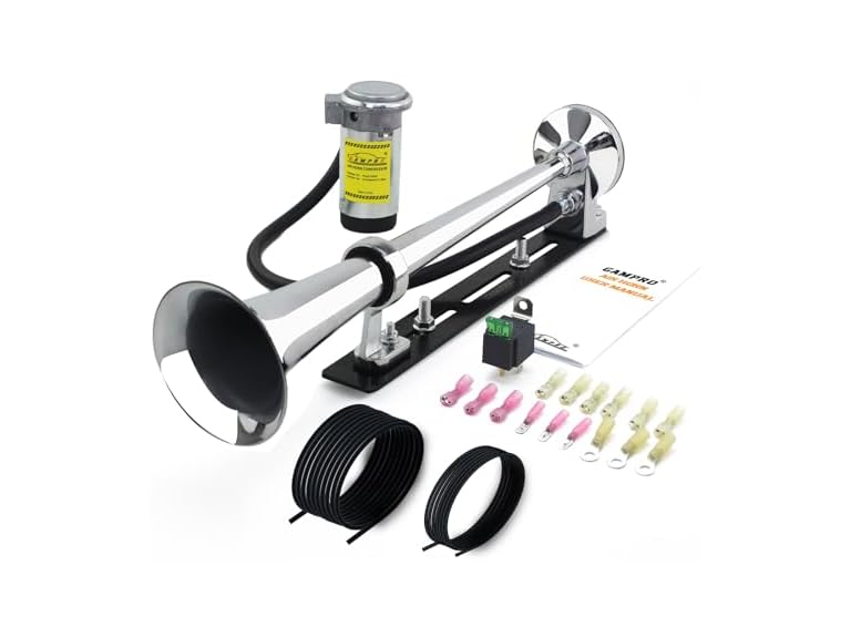 - GAMPRO 12V 150DB Air Horn with bracket Kit, 18 Inches Chrome Zinc Single Trumpet Truck Air Horn with Compressor and bracket for Any 12V Vehicles Trucks Lorrys Trains Boats Cars (black and silver)