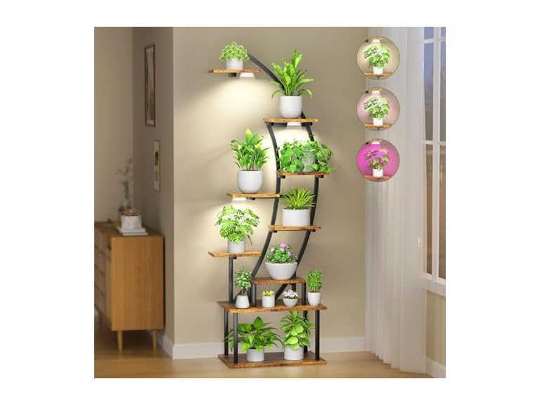 - Plant Grow Lights with 3 Light Color Modes:The corner plant stand is equipped with two-head LED full-spectrum grow light with 3 light color modes (warm white+purple, warm, purple), which can switch modes freely to provide optimal lighting for every stage of plant growth, from leaf development to flowering. And the 10-level adjustable brightness and 3/9/12-hour timed lighting ensure your plants get the perfect amount of light during the day and night, keeping your plants vibrant and healthy.