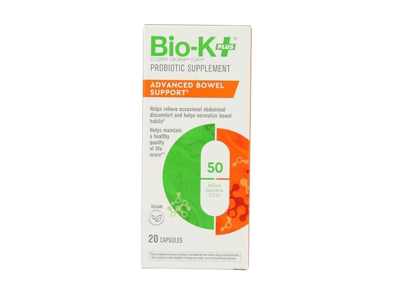 - Bio-K Plus Advanced Bowel Support Probiotic Supplement, Vegan Friendly, Gluten Free, 20 Capsules (Pack of 1)