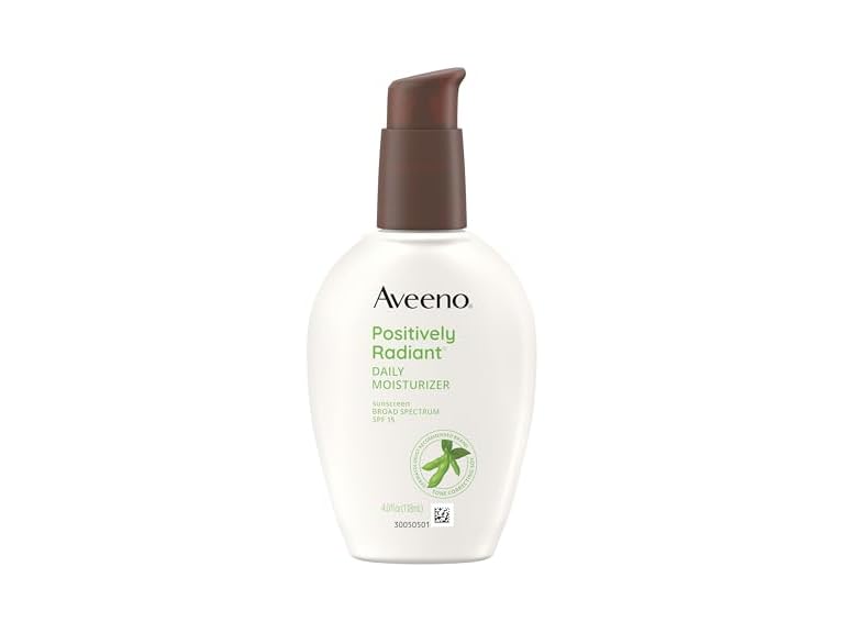 (1) Aveeno Positively Radiant Daily Face Moisturizer with SPF 15 Sunscreen, Hydrating Facial Moisturizer with Soy Extract to Improve Skin Tone and Texture, Hypoallergenic Formula, Oil-Free, 4 FL OZ