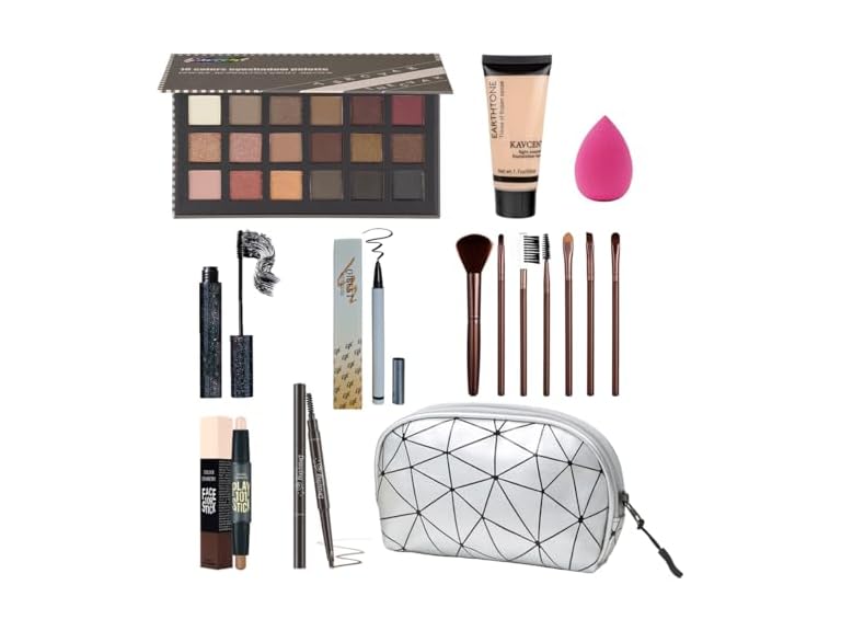 - 【Makeup Kit Includes】16 Colors Eyeshadow Palette, Liquid Foundation, Lip Gloss, Contouring Stick, Waterproof Eyeliner Pencils, Eyebrow Pencils, Mascara, Powder Puff, 7Pcs Makeup Brushes