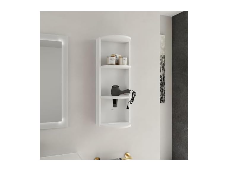 - Space-saving wall-mounted design with specialized features including a hairdryer holder and tissue box compartment