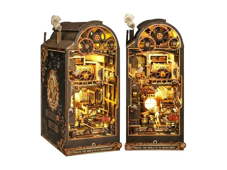 - 【Immersive Steampunk Building Experience】This DIY book nook features a steampunk theme centered on steam engines and industrial machinery. Precision cutting wooden pieces with authentic brass-finish gears and interlocking industrial mechanisms, Features functional rotating flywheels and pressure gauge dials that replicate Victorian-era machinery
