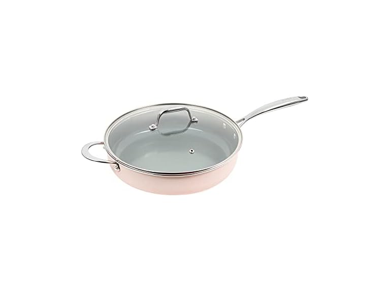 - (1) Goodful Ceramic Nonstick 4 Quart Deep Saute Pan with Lid, Dishwasher Safe Pots and Pans, Comfort Grip Stainless Steel Handle, Skillet Frying Pan, Made without PFOA, Blush