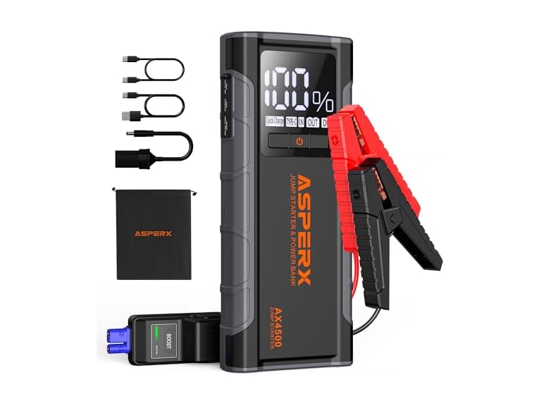 - 【ALL-IN-ONE JUMP STARTER】AsperX 4500A battery jumper starter portable adopts the latest upgraded smart chip in 2025, which greatly improves its working efficiency. It integrates car battery jump starter, flashlight, mobile device charging, DC output power supply, Type-C PD30W input and output, and a 4-inch large screen into one.