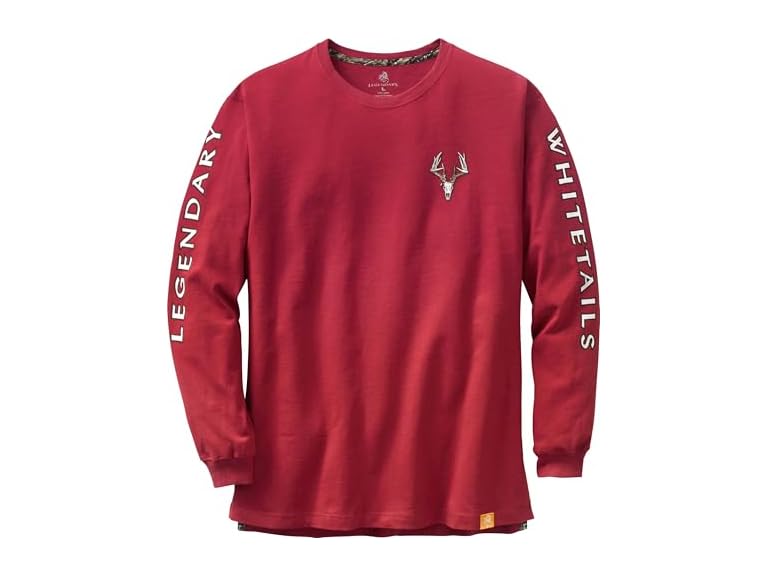 - (1) Legendary Whitetails Men's Long Sleeve T-Shirt Graphic Tee Preshrunk 100% Heavyweight Cotton, Cardinal, 4X-Large