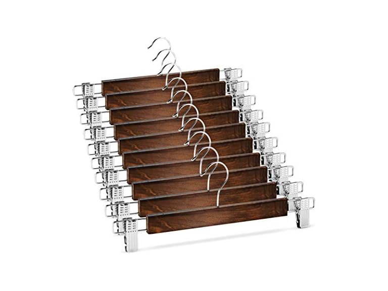 - (1) Zober High-Grade Wooden Pants Hangers with Metal Clips Grip, Smooth Finish Solid Wood Jeans/Skirt Hanger, 360 Swivel Hook - Clip Hanger for Pant, Skirts, Slacks - 20 Pack, Vintage Wood