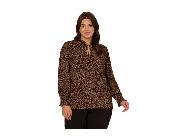 - (1) Adrianna Papell Diffusion Women's Ruffle Tieneck Long Sleeve Top, Black/Camel Basic Leopard, 2X