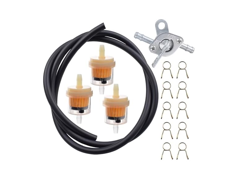 - 【KIt Includes】1×Hose Tube Line; 1×Shut Off Valve Petcock Switch ; 3×Fuel Filter; 10×Hose Clamp