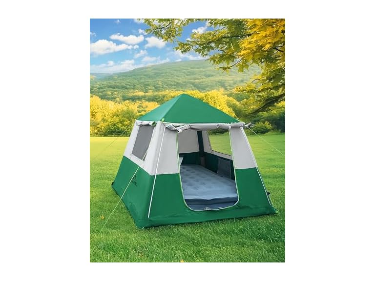 - 【SPACIOUS AND CONVENIENT】The 4-person instant cabin tent is 7.5ft x 7.5ft and fits one full-size mattresses easily with plenty of extra space, you can stand fully upright when changing clothes with a peak height of 5.8ft.