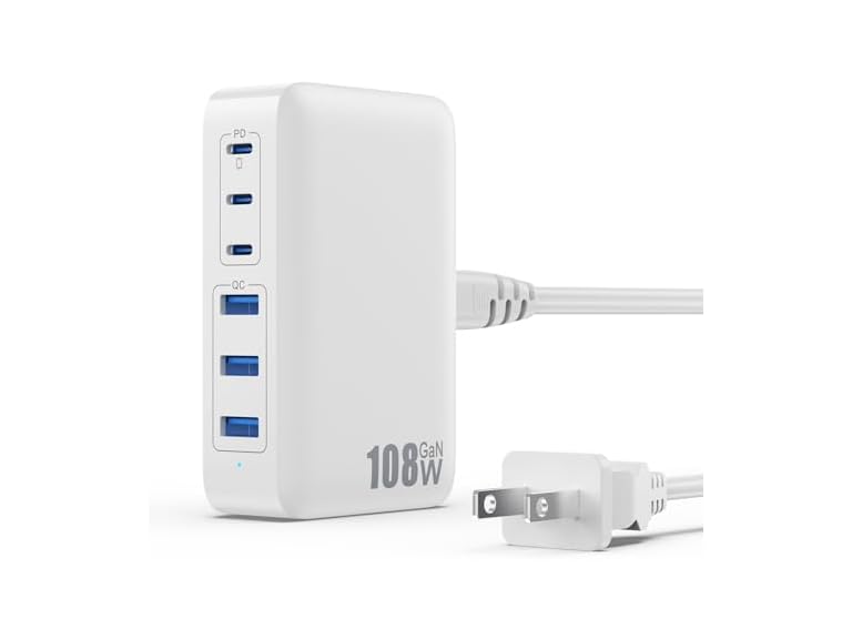 - ⚡【Super Fast USB C Charger Block】Our Gkutw's usb c charger is true 108w Total Power, great choice for those who have multiple device charging needs. This fast usb c charging station has independent 3 USB-C Power Delivery fast ports and 3 USB-A QC3.0 ports, support 6 devices charging simultaneously. Super fast charges iPhone 15 from 0% to 60% in just 30 minutes; perfectly for home, office, travel;