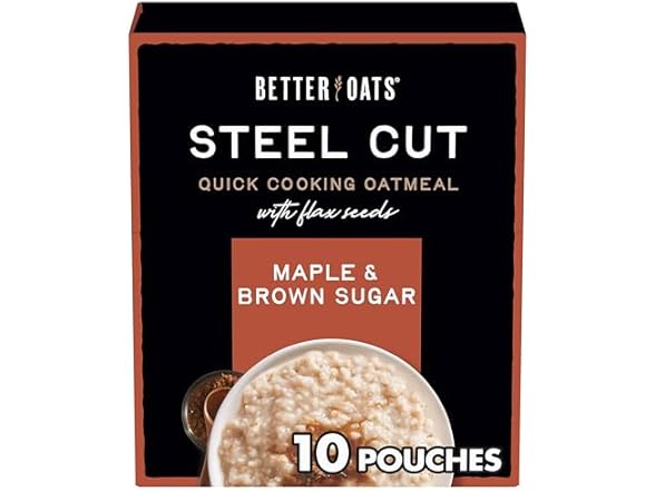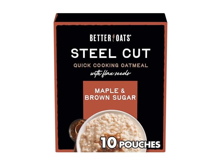 - Includes ten (10) 1.51 oz pouches of Better Oats Maple and Brown Sugar Steel Cut Oatmeal with Flax Seeds, Instant Oatmeal Packets