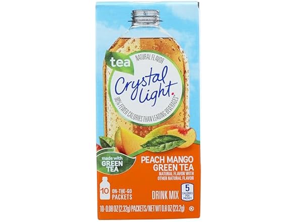 - Crystal Light Naturally Flavored Peach Mango On-The-Go Powdered Drink Mix with Caffeine offers a convenient refreshing drink