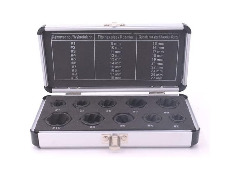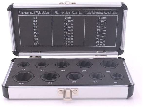 - (1) Generic AAP-Tool-194 Screws Remover Extractor Kit - 10-piece nut extractor short aluminum box Name: Nut extractor Specification: 10pc Series: Nut extractor Caliber:9(0.35'')/10(0.39'')/11(0.43'')/12(0.47'')/13(0.51'')/14(0.55'')/15(0.59'')/16(0.63)/17(0.67 '')/19(0.75'')mm Hexagon size: 16/16(0.63'')/19/19(0.75'')/22/22(0.87'')/25/25(0.98'')/27(1.1'')mm. Packaging: 168mm/80mm35mm(6.61’’3.15’’1.37’’)