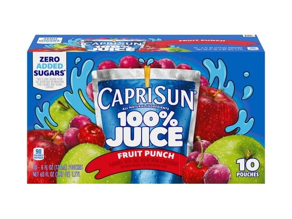 - One 10 ct box of Capri Sun 100% Juice Fruit Punch Flavored Juice Blend from Concentrate with added ingredients and other natural flavors (6 fl oz pouches)