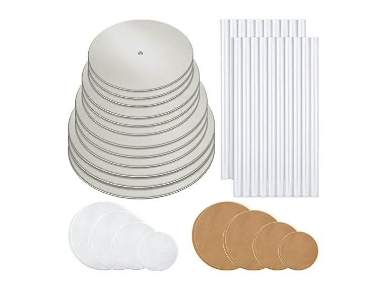 - Package includes: the package contains 12 pieces of cake boards with 4 different sizes, 80 pieces of parchment paper, and 20 pieces of plastic dowels to make 3-tiered cakes, or even more layers of cakes, making it easier to layer your cakes and full of fun