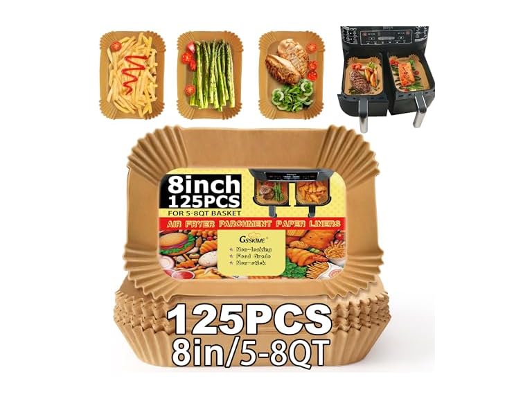- (1) GSSKIME Air Fryer Liners Disposable, 125PCS Air Fryer Liners for Ninja 2-Basket Air Fryer, Natural Non-stick Airfryer Liners, 8.6x5.5 Inch Rectangular Parchment Paper Liners for DZ201, DZ401, FG551