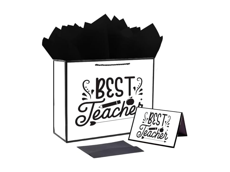 - (1) JWSCYSY 12.6" White and Metallic Black Gift Bag with Card and Tissue Paper, Gift ideas for Teacher Graduation Retirement Celebration Birthday (Best Teacher)