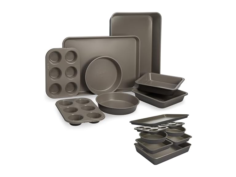 - STACKABLE, SPACE SAVING DESIGN: All eight bakeware pieces were designed to completely nest into one another for compact storage and a clutter-free cabinet. The end result…a complete bakeware collection within a 17.5 x 12.5 x 3.5 inch footprint.