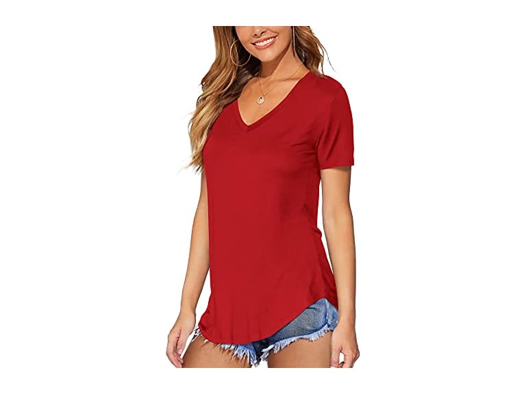 - (1) DittyandVibe Women Short Sleeve V Neck Curved Hem Tunic Tops T Shirts (Red,M)
