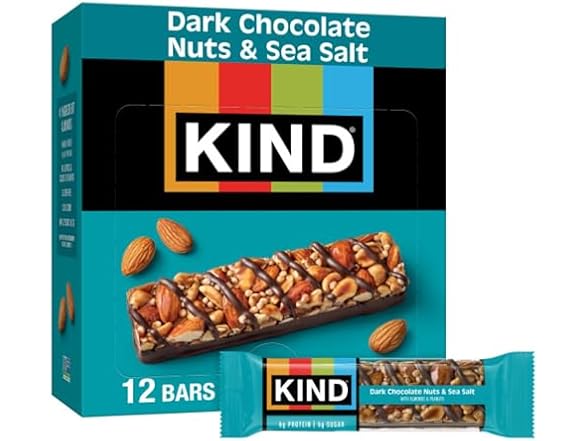 - Twelve 1.4 oz KIND Snack Bars, Dark Chocolate Nuts and Sea Salt gluten-free bars