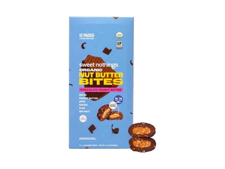 - BURSTING WITH FLAVOR: Sweet Nothings Chocolate Nut Butter Bites — made without added sugar and with only 150 calories per pack. These organic, plant-based bites are as tasty as they are nutritious, giving you a feel-good snack you’ll crave again and again.