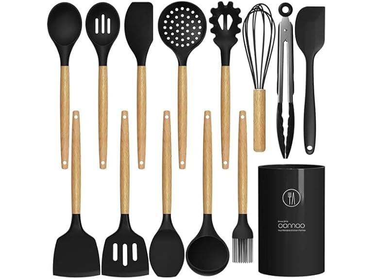 - (1) 14 Pcs Silicone Cooking Utensils Kitchen Utensil Set - 446°F Heat Resistant,Turner Tongs, Spatula, Spoon, Brush, Whisk, Wooden Handle Gray Gadgets with Holder for Nonstick Cookware