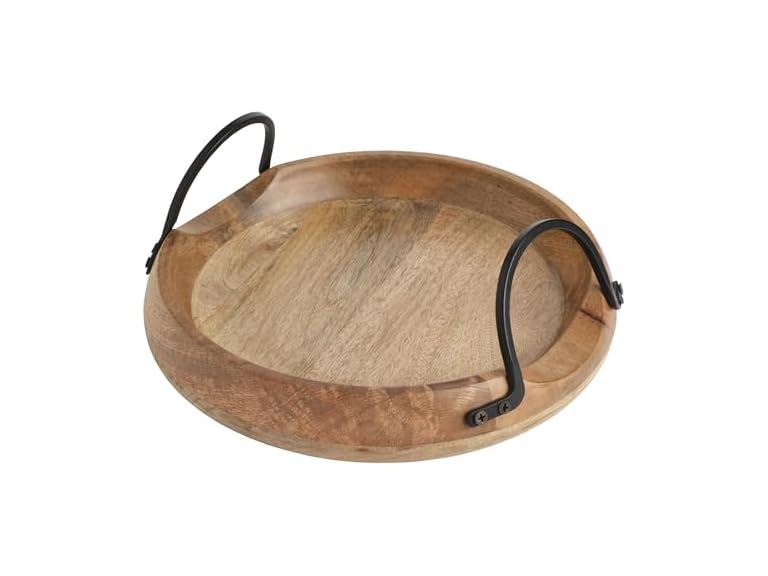 Serve in style with this Gourmet Basics Knox Mango Wood Serving Tray by Mikasa. Handcrafted from mango wood with varying grain colors that add a rustic look to your home, this smartly designed tray has durable iron carrying handles and high walls to keep items in place. Perfect for presenting arrangements of cheese and crackers, charcuterie, cocktails, appetizers, cupcakes, and so much more. This multiuse tray can also be used to hold personal care products, small items like wallets, phones, and keys, or to display small trinkets on a table or dresser. Measures 4-1/2 inches high with a 12-1/4 inch diameter. Wipe clean with a soft, damp cloth.