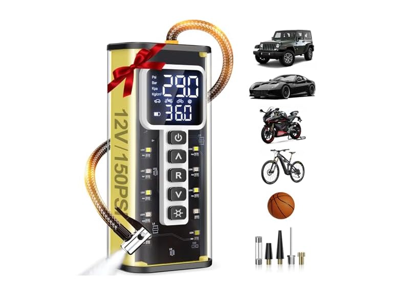 - 【Precision Inflation, Effortless Control】Featuring a bright LED display and professional-grade pressure sensor, this smart air pump delivers accurate, real-time PSI monitoring down to ±1% precision. Set your desired pressure and relax – the auto-shutoff tire inflator instantly stops inflation at the exact target, eliminating overinflation risks. Perfect for drivers who demand both set-and-forget convenience and professional-level accuracy for cars, bikes, motorcycles and more