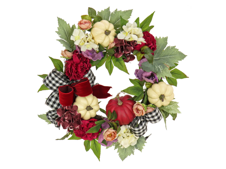 Welcome the Fall season with this 28" artificial harvest wreath. This adorable greenery features purple, burgundy, and white peonies to add contrast to the traditional harvest colors. White and purple pumpkins are a perfect addition with bow accents. Impress neighbors and friends by displaying this stunning harvest greenery on any entryway or fireplace mantel.