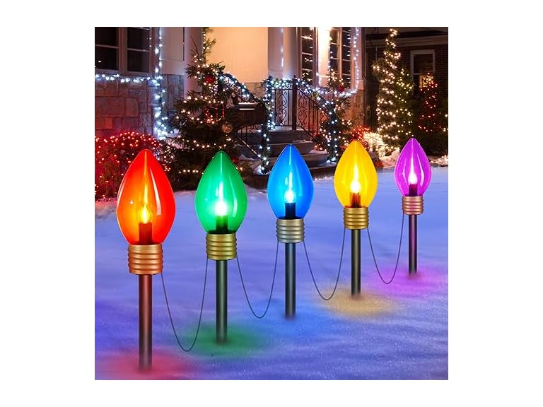 - Specifications of Christmas Pathway Lights Outdoor: Jumbo c9 bulbs covered c7 Christmas string lights, external jumbo c9 bulb size: 7.5 x 3.7 inches, internal c7 lighted bulb size: 0.9 x 2.1 inches. 8.5 Feet long strand with 5 c7 bulbs and 5 jumbo c9 multicolored bulbs, 18 inches spacing, 10.8 inches pathway markers, E12 socket compatible. This Christmas lights for the sidewalk will be great for your pathway, garden, courtyard, outdoor holiday Christmas decorations