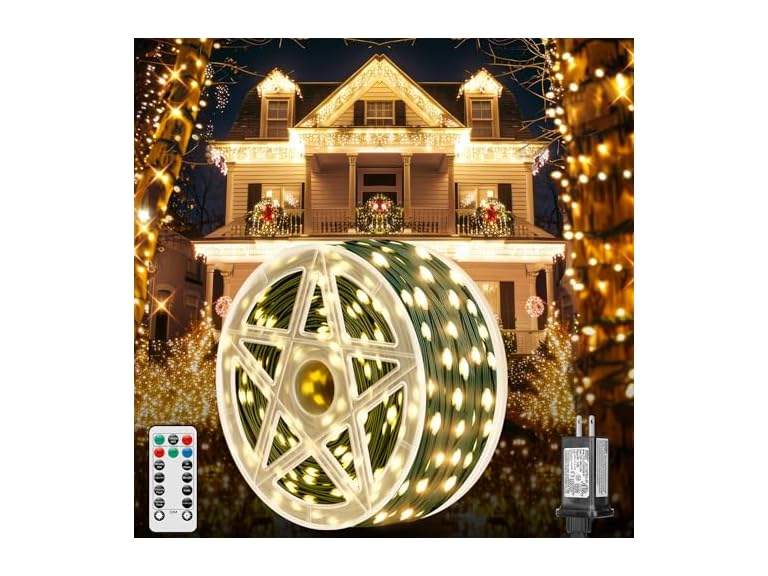 - 8 DYNAMIC MODES & DIMMABLE: Effortless Control! LED Christmas lights use the included remote to switch between 8 festive lighting modes: twinkle, wave, fade, and more, creating a lively Christmas atmosphere. Plus, adjust brightness with 4 dimming levels—saving energy and setting the perfect mood to wow your neighbors