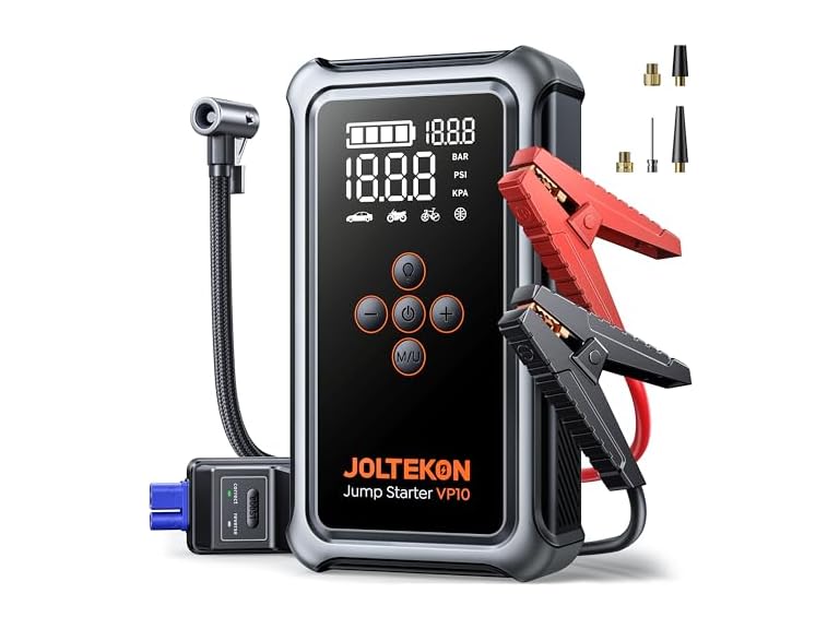 - 【V0 Fireproof & 10-Safety Protection】Engineered with V0 rated flame retardant materials and a reinforced shockproof casing, this portable car battery charger with stands extreme conditions. The jumper cables feature 10 protections, including reverse polarity, spark-proof, short-circuit, overvoltage, overheating, and temperature safeguards, ensure complete safety for you, your vehicle, and your devices during jump starts, charging, or inflation.
