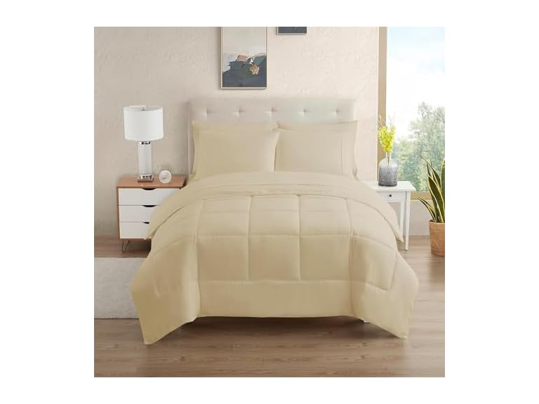 - (1) Sweet Home Collection 7 Piece Comforter Set Bag Solid Color All Season Soft Down Alternative Blanket & Luxurious Microfiber Bed Sheets, Beige, Queen