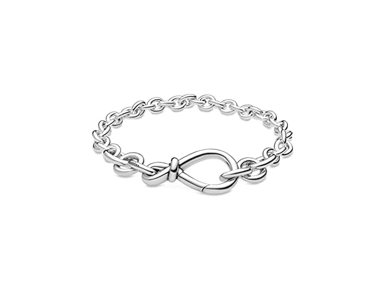 - It's double the love with Pandora’s unique interpretation of the infinity symbol. The iconic knot wraps around the asymmetrically-set center to signify the strength of the connection. This chunky sterling silver infinity knot bracelet is the perfect representation of an unbreakable bond and a classic addition to your bracelet collection. The infinity clasp opens and can be styled with up to two Pandora Moments dangle charms or pendants.
