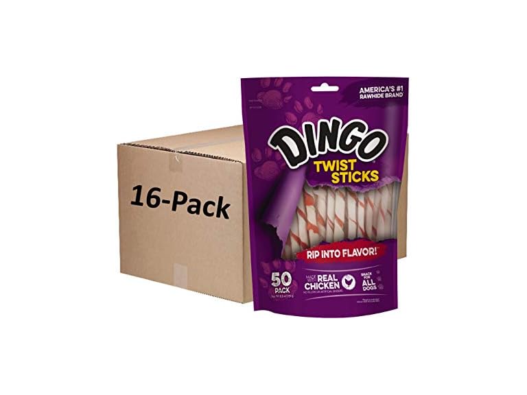 800-COUNT (1 CASE OF 16 PACKS OF 50 INDIVIDUAL STICKS) Dingo brand’s real meat and rawhide combinations deliver healthy and delicious chews to promote clean teeth (due to the natural action of chewing). These premium rawhide chews are available in a range of irresistibly tasty treats that dogs love.Dingo Twist Sticks provide your dog with a fun and delicious treat that’s bursting with flavor! Dogs love the great taste of these twist sticks, made with real chicken wrapped with premium rawhide. A great source of protein, this irresistible combination makes Dingo Twist Sticks the perfect treat for any size dog. These healthy, fun chews promote clean teeth through the natural action of chewing. Resealable package contains 50 sticks. Look for other fun Dingo shapes and sizes, too!Give your dog up to one Dingo Twist Stick per day. For supervised consumption only. Select a chew slightly larger than your pet’s mouth. Discard chunks or fragments. Always provide plenty of fresh drinking water and visit your veterinarian regularly.Dingo brand combines powerful flavors and benefits to create bones, chews and treats that are sure to keep you and your dog wanting more. Shop our wide variety of shapes and flavors, with options for any size companion!
