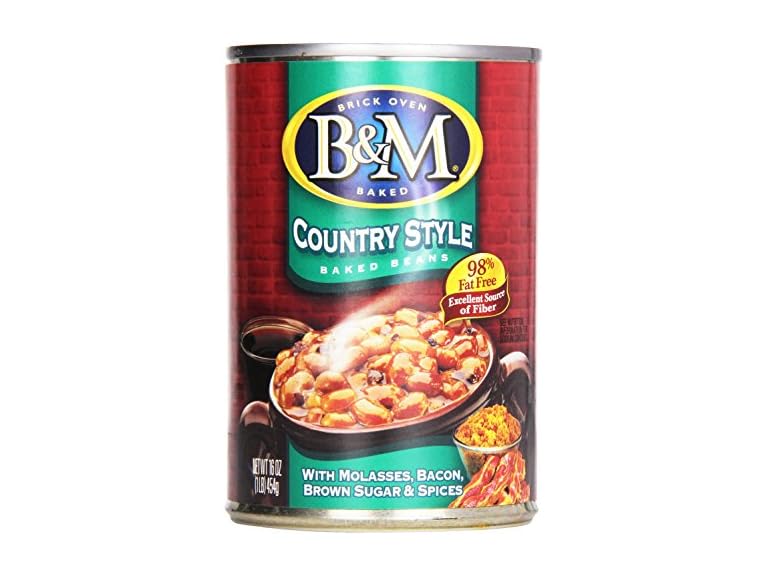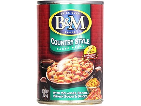 With molasses, bacon, brown sugar & spices. 98% fat free. Excellent source of fiber. See nutrition information for sodium content. Brick oven baked. Delicious B&M Baked Beans are slow-baked in brick ovens for hours. Our baking method produces baked beans with a perfect texture and deep flavor unlike any others. B&M Baked Beans are sweetened with molasses and sugar, are an excellent source of fiber and 98% fat free. With B&M Baked Beans, you’ll enjoy every spoonful! www.bmbeans.com.