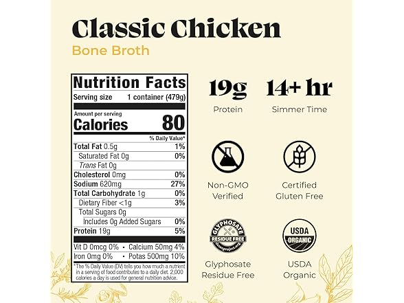 - High quality premium ingredients: our bone broth is made with bones from pasture-raised chicken & organic herbs, veggies, and spices. our organic bone broths are also dairy-free, non-gmo, gluten-free. no hormones, antibiotics, or additives ever.