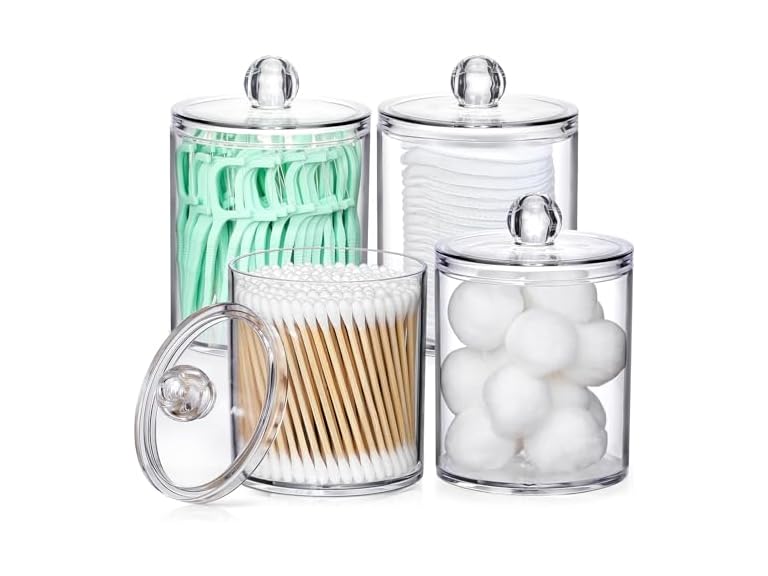 - (1) 4 Pack Acrylic Qtip Holder Dispenser for Cotton Swabs, Balls, Pads, Floss Picks- Small Clear Plastic Canister Apothecary Jar Set, Bathroom Essentials Accessories Decor, Vanity Makeup Storage Organizer
