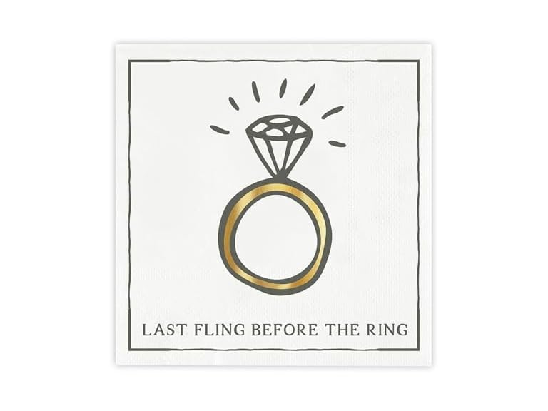 - BEVERAGE NAPKINS Gold foil ring design and a fun phrase "Last Fling Before the Ring"; great for bridal shower and bachelorette parties
