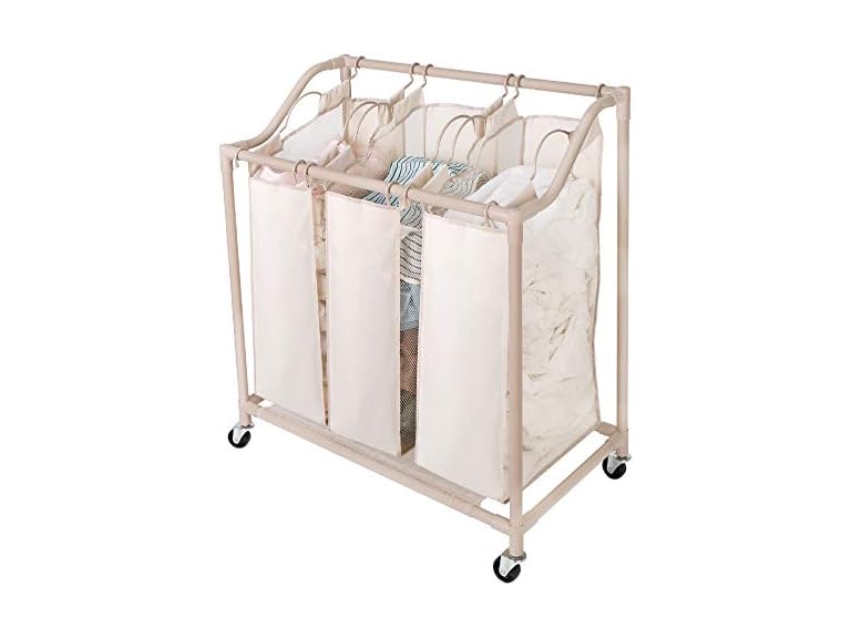 - (1) Smart Design Deluxe Rolling Triple Compartment Laundry Sorter Hampers with Wheels - Holds 6 Loads - Sturdy Steel Metal Frame - Clothes and Laundry - Home Organization - 30 x 32 Inch - Beige
