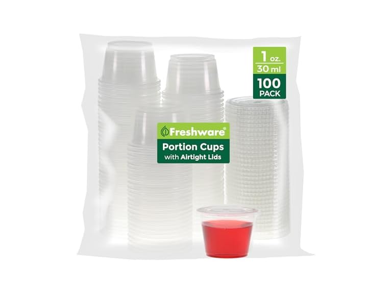 - Freshware Plastic Portion Cups with Lids [1 Ounce, 100 Sets] Disposable Plastic Cups for Meal Prep, Salad Dressing, Jellos Shot Cup, Condiment and Dipping Sauce Cup