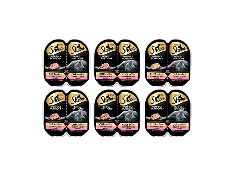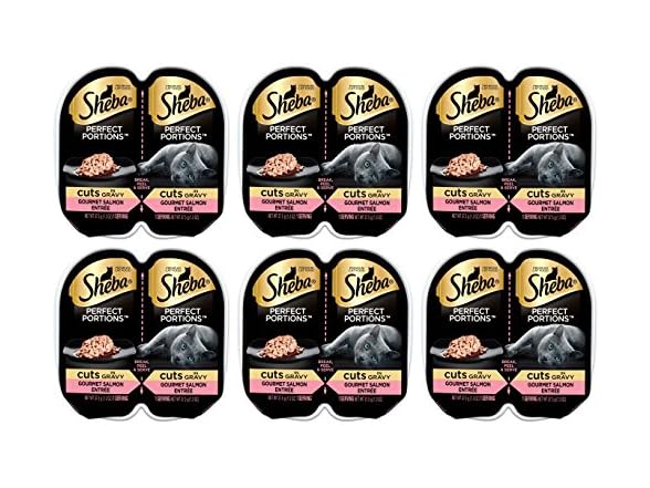 Sheba Perfect Portions Premium Cat Food - Cuts In Gravy - Gourmet Salmon Entrée - Pack of 1 Container. Your cat knows what they want, and knows how to get it. Give them SHEBA Wet Cat Food. Each SHEBA Wet Cat Food Pate recipe is made with real protein, essential vitamins, and minerals, so its as nutritious as it is delicious. This wet cat food is made without corn and artificial flavors or preservatives; and since its so delectable and easy to chew, your cat will devour every tasty bite. SHEBA PERFECT PORTIONS Pates offer two convenient servings in each tray to ensure freshness without leftovers. Show your cat some love; whether your fancy feline is a kitten, adult, or senior cat, this soft wet food is sure to satisfy even the pickiest appetite. Savor every delicious moment with SHEBA Wet Cat Food: What Cats Want.