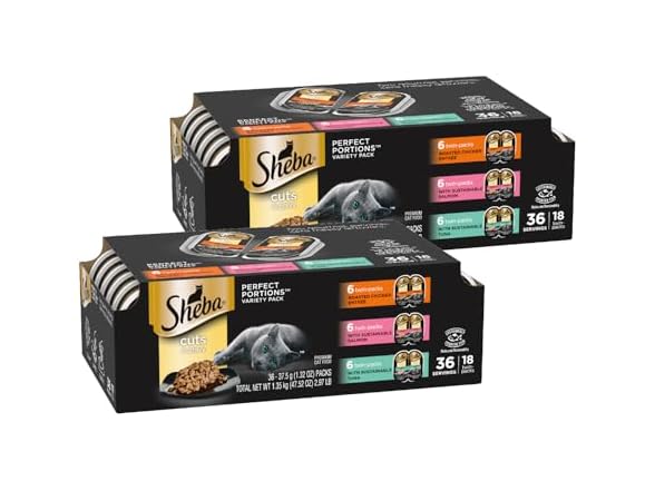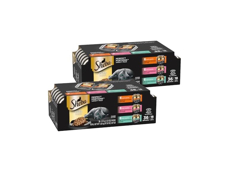 - (1 PACK) Sheba Perfect Portions Wet Cat Food Cuts in Gravy, Roasted Chicken Entree, with Sustainable Salmon, and with Sustainable Tuna, 2.6 oz. Twin-Pack Trays (18 Count, 36 Servings)