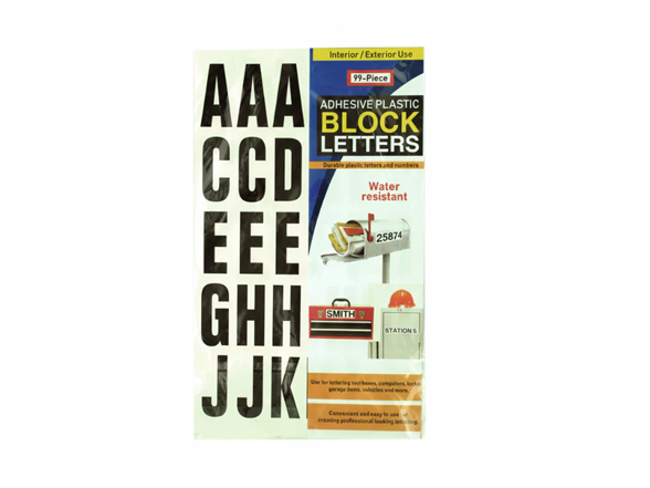 - 99-piece set of adhesive plastic block letters and numbers