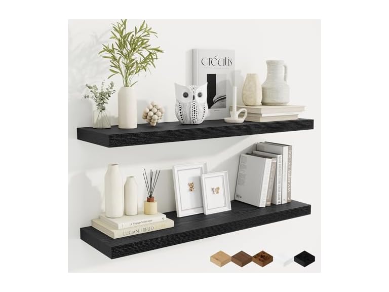- Rustic Wooden Floating Shelves: Crafted from sturdy MDF, these floating shelves feature robust iron brackets that support up to 40 lbs. The durable build provides a reliable surface for displaying photos, trophies, and decorative items